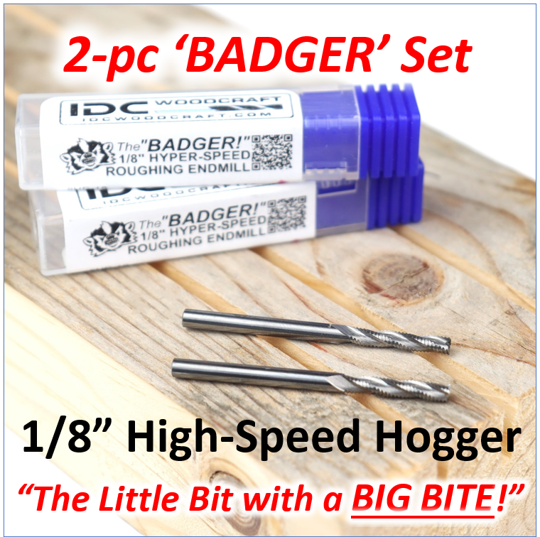 If you’ve experienced long carve times with your 1/8” bits, or even had them break because they cannot handle the workload, then double the output with this 2-piece set of the “BADGER” high-speed roughing endmill bits by IDC Woodcraft.